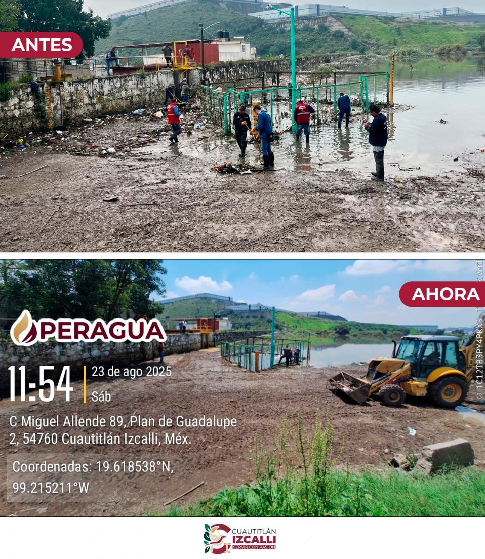 Desde temprana hora, se intensificaron las labores de limpieza en la presa El Ángulo, con personal de Operagua y Servicios Públicos, tanto manualmente como con retroexcavadora y camiones de volteo para trasladar la basura al sitio de disposición final. Asimismo, la CAEM se sumó a estas labores con una cuadrilla de siete personas.