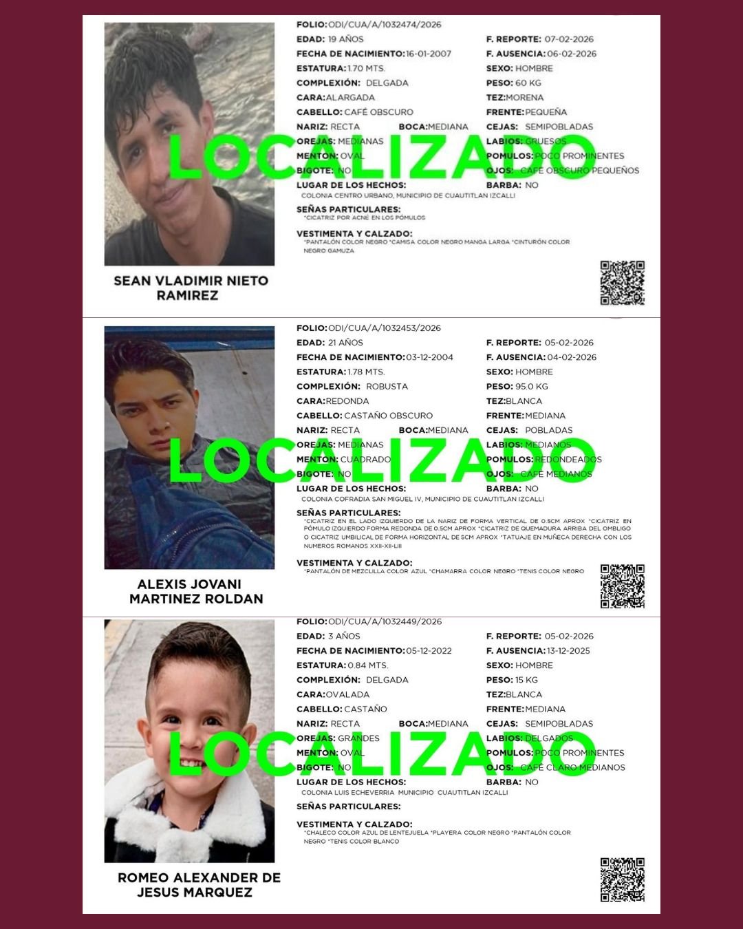 Cada una de estas intervenciones se realizó bajo los protocolos correspondientes, garantizando la protección, integridad y acompañamiento institucional hasta su reintegración con familiares. El Gobierno Municipal de Cuautitlán Izcalli reafirma su compromiso de trabajar de manera coordinada con instancias estatales y federales para fortalecer la búsqueda y localización de personas, priorizando en todo momento el bienestar y la seguridad de las familias.