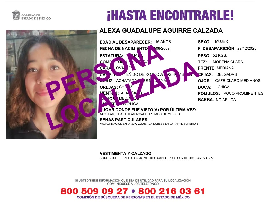 En cuanto a los casos específicos, Alexa, con fecha de desaparición del 29 de diciembre de 2025, retornó a su domicilio por voluntad propia; posteriormente, autoridades acudieron al lugar para activar los protocolos correspondientes. Por su parte, Leonardo regresó a su hogar horas después de que sus familiares levantaran la ficha de búsqueda, ocurriendo lo mismo en el caso de Raquel.