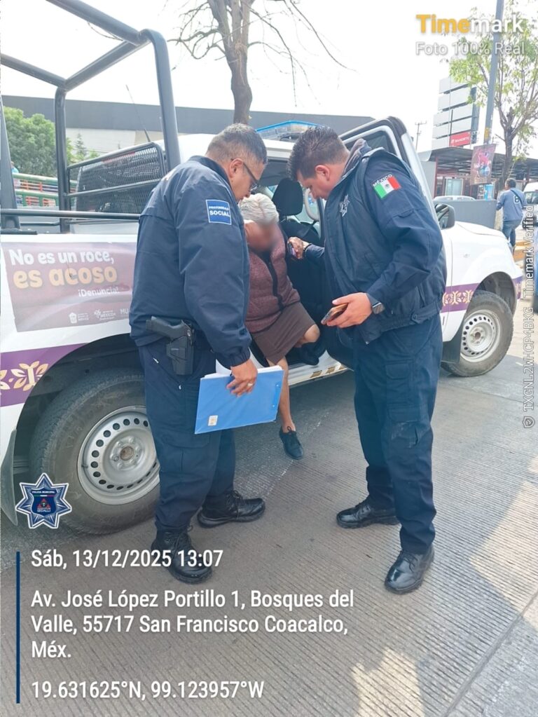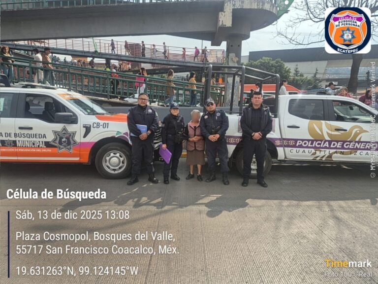 Elementos de la Unidad de Género ubicaron a la adulta mayor que se encontraba desorientada, por lo que, de manera inmediata llamaron a la unidad de la Célula de Búsqueda. La mujer de 80 años se encontraba en el municipio de Coacalco de Berriozábal, dijo ser de Cuautitlán Izcalli por lo que se inició de manera inmediata acciones de búsqueda y localización de sus familiares, procediendo a encontrar a su hijo con residencia en el municipio de Ecatepec de Morelos.